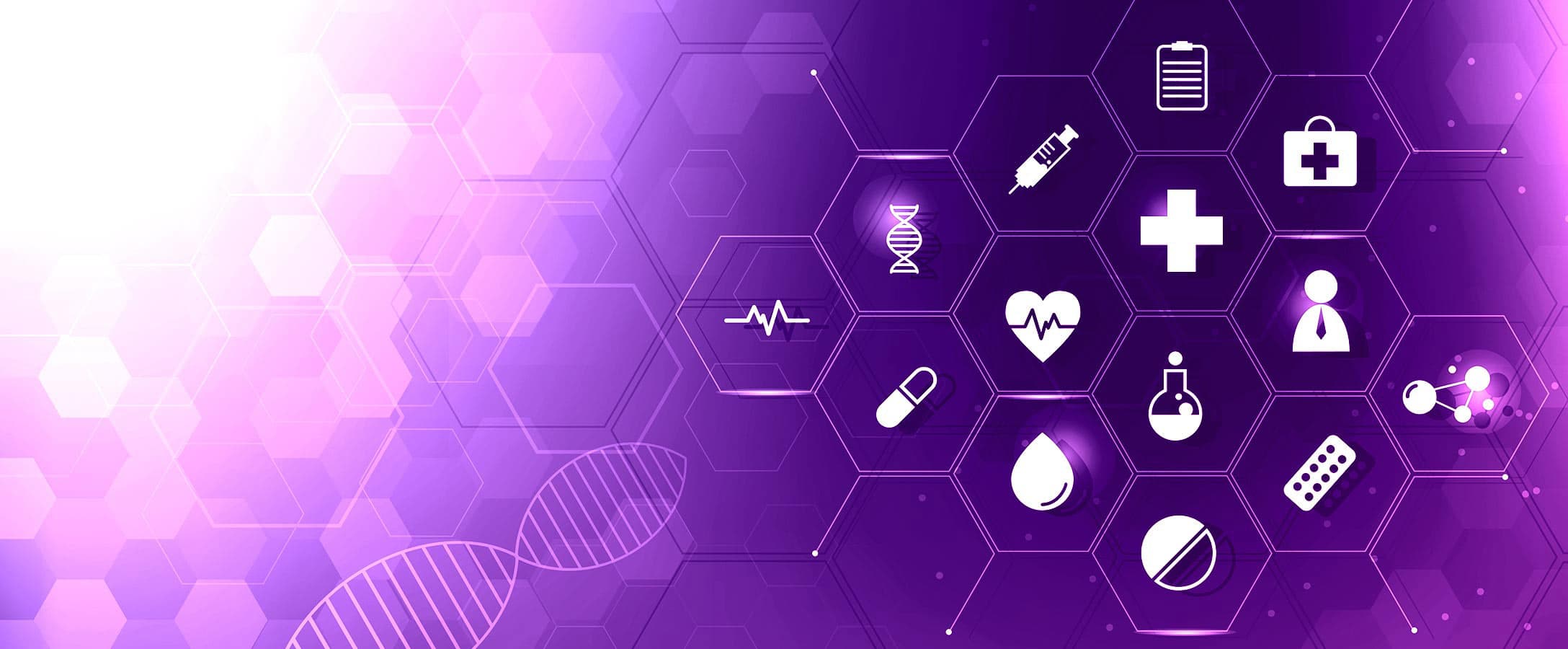 • An illustration of a shield with a cross on it, a clipboard with a heart on it and prescription pills overlaid.