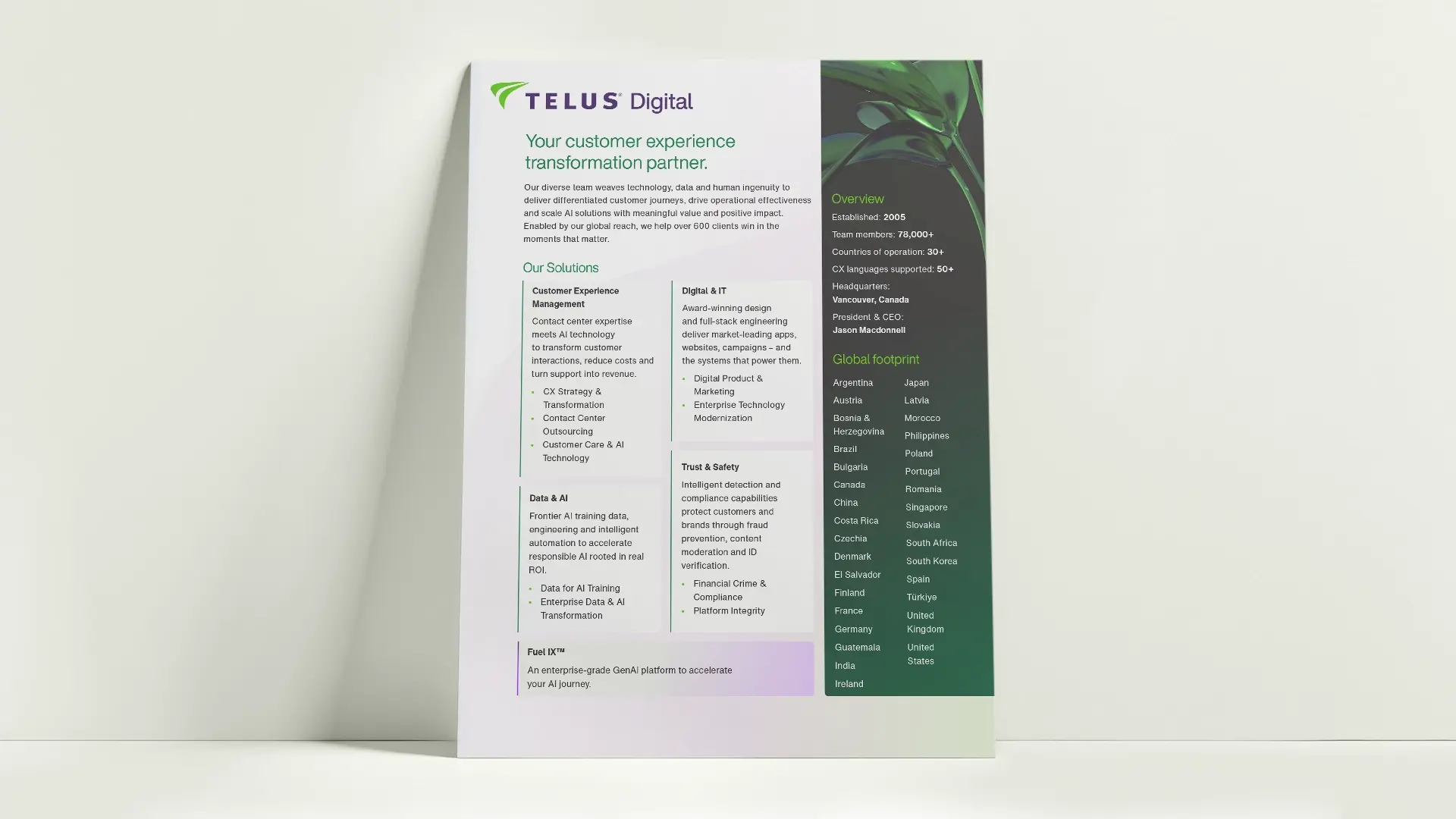 At TELUS Digital, we empower the human experience through digital enablement, agile and lean thinking, spirited teamwork, and a caring culture that puts customers and the value of human connection first. Learn more about who we are and what we do.