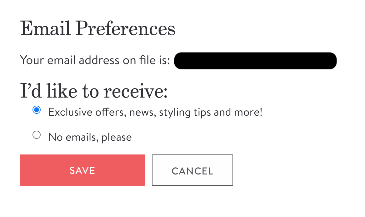 Avoid asking customers to make this all-or-nothing choice, and offer at least one option to opt down (e.g., once a month, only when there’s a sale) to avoid closing off this marketing channel altogether.