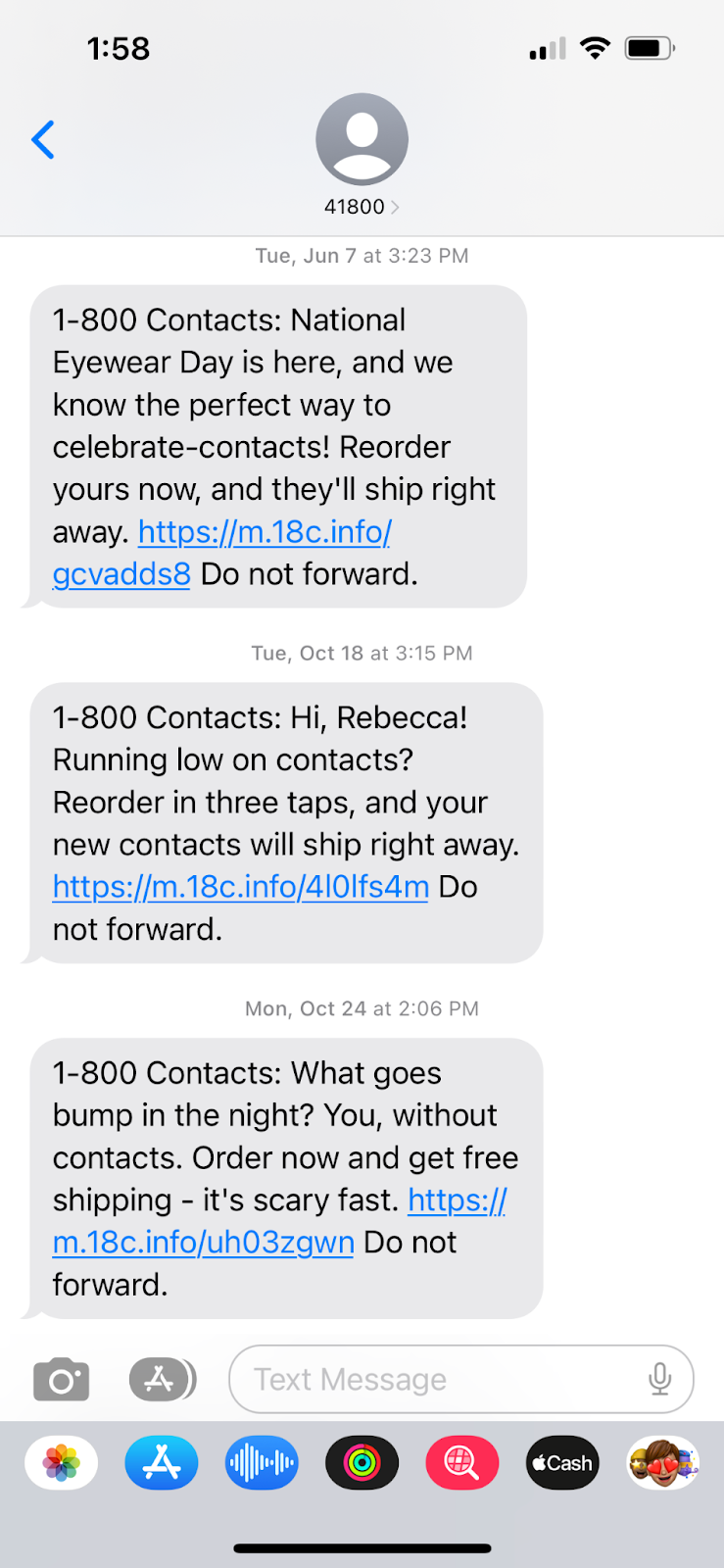 In the six months that followed my purchase, I received five SMS messages and eight emails asking if I’d like to order more. (Note: I’m not counting the glasses cross-sell, eye-health newsletters or end-of-year FSA reminders, which I’d consider valid use cases for this user).