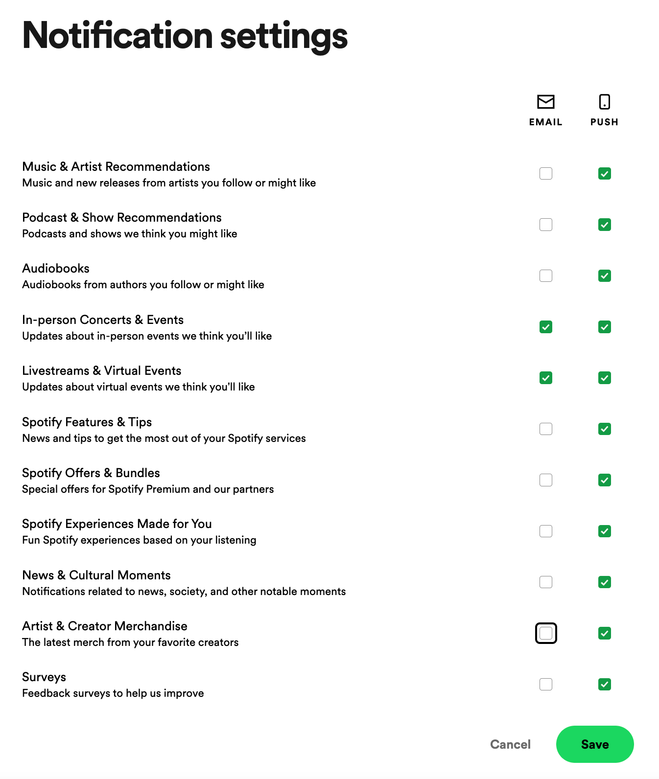 Spotify does a great job with this. For every type of notification, users can choose email, push, both or neither. This allows me to say yes, send me all the emails about concerts, but everything else I’d prefer to receive as a push notification.