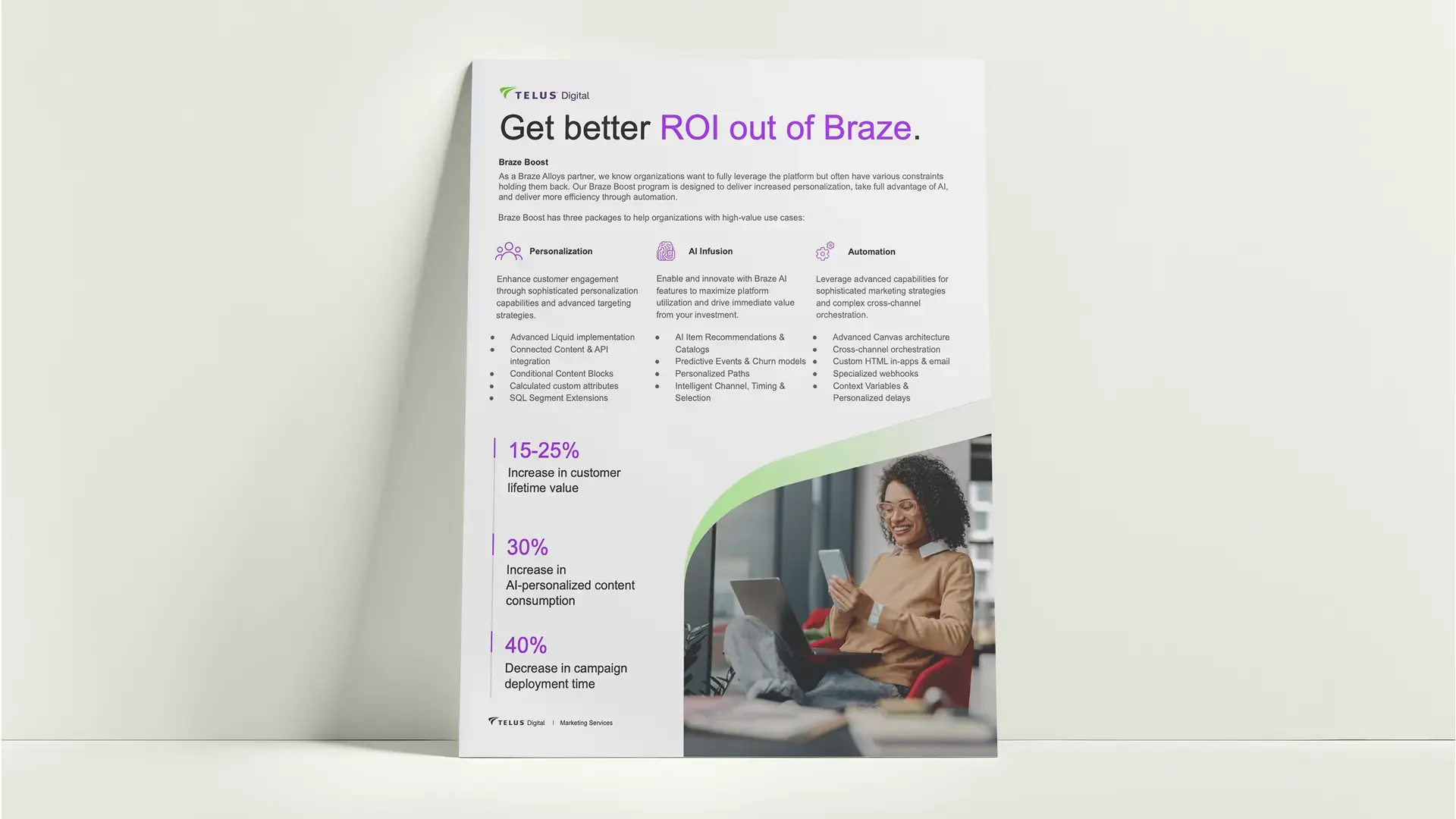 Unlock the most robust Braze features that drive ROI and create efficiency for your marketing teams. Braze Boost offers three distinct, short-term packages, each targeted at one of the major pain points we've seen across dozens of client implementations: personalization, automation and AI infusion.